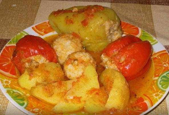 - Als de aardappelen zacht zijn, maar nog niet uit elkaar zijn gevallen, voeg dan het tomatensap toe en bak nog 5 minuten samen. Serveer de paprika's met aardappelen, overgiet met de saus. Eet smakelijk!