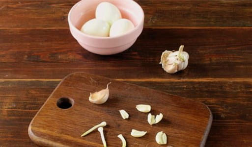 - Hardgekookte kippeneieren in gezouten water, afkoelen en pellen. Pel de knoflookteentjes, snijd ze in de lengte door en verwijder het klokhuis, hak ze fijn.