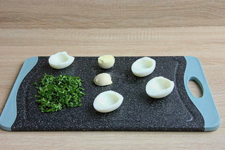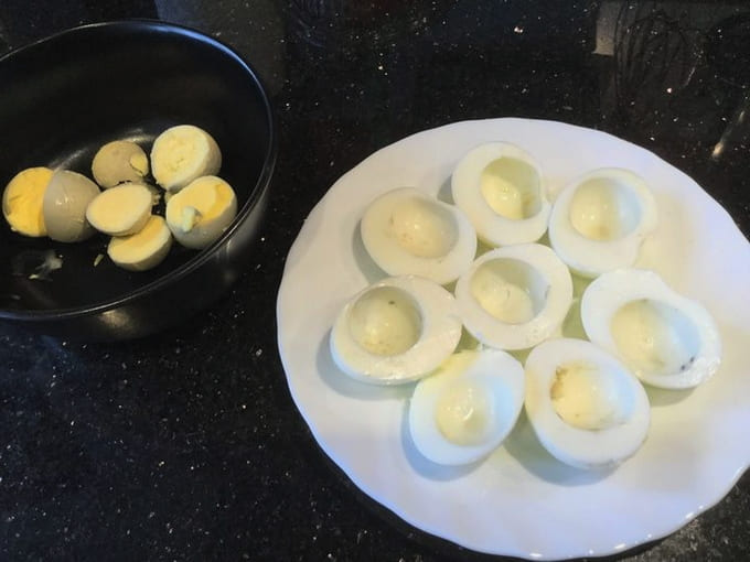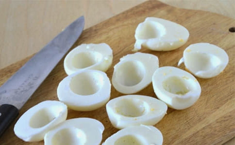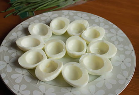 - Snijd de eieren doormidden, verwijder de dooiers.
