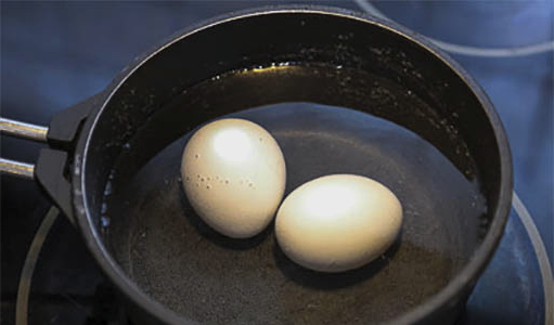 - Giet de eieren met water, plaats op het fornuis en kook tot ze gaar zijn gedurende 10 minuten.