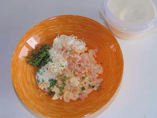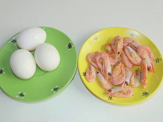 - Hardgekookte eieren, in de koelkast bewaren en pellen. Dompel de garnalen 2-3 minuten in kokend water en verwijder vervolgens de schelpen.
