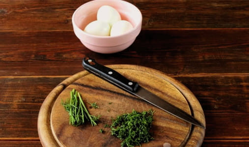 - Kook kippeneieren in gezouten water, pel ze, halveer ze en scheid het eiwit van de dooiers. Was de greens en hak ze fijn.