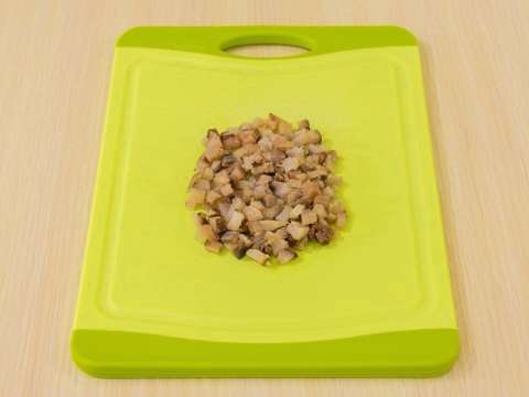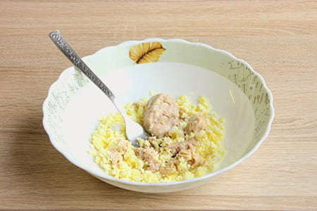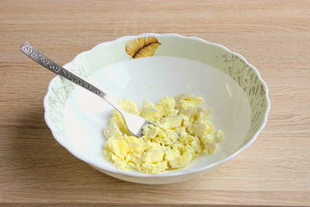 - Snijd de gezouten haringfilet in kleine blokjes, voeg ze toe aan de dooiermassa. Breng de vulling op smaak met peper en zout.