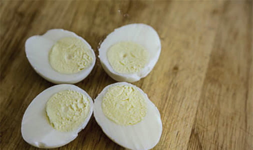 - Als de eieren zijn afgekoeld, pel ze en snijd ze doormidden. Scheid de eiwitten van de dooiers.