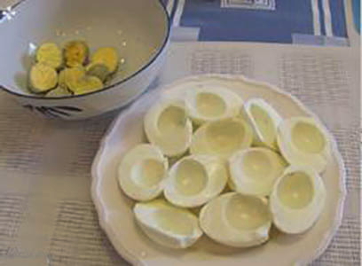 - Dompel de eieren in water en kook ze hard. Als de eieren zijn afgekoeld, pel ze en snijd ze doormidden. Scheid de dooiers van de eiwitten.