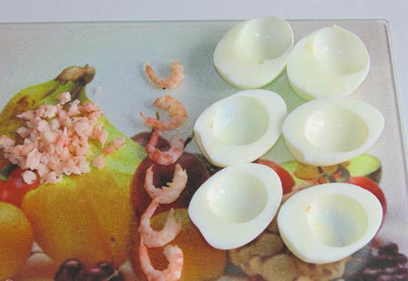 - Snijd de eieren doormidden en scheid het eiwit van de dooiers. Snijd een deel van de garnalen in plakjes, laat een deel heel voor decoratie.