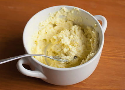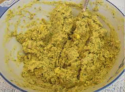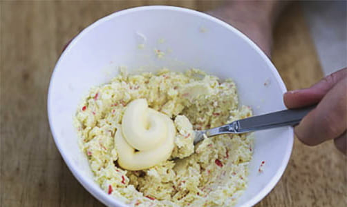 - Prak de dooiers met een vork in een kom, meng ze met knoflook, kruiden, kaas en mayonaise.