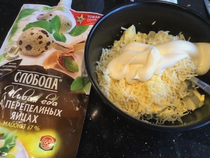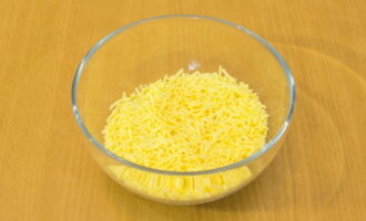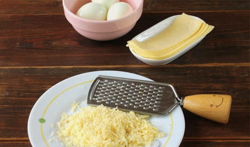 - Rasp krabsticks en kaas op een grove rasp. Combineer dooiers, krabsticks, kaas en mayonaise.