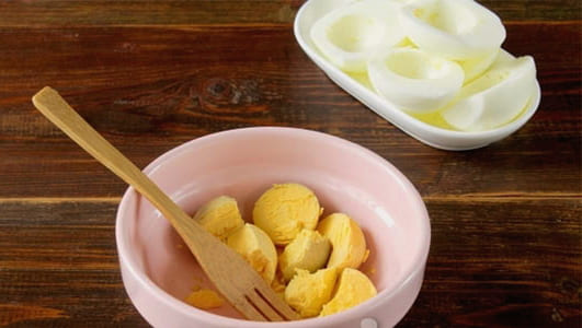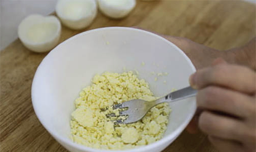 - Verwijder de dooiers en prak ze met een vork.