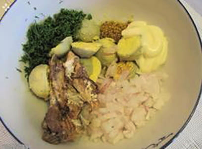 - Hak de ui en kruiden fijn. Doe de dooiers, ingeblikte vis, uien en kruiden in een kom, meng.
