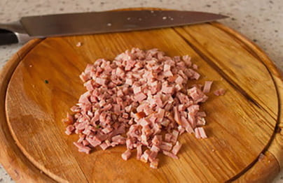 - Snijd de ham in kleine blokjes. Rasp de kaas. Hak de greens fijn met een mes.