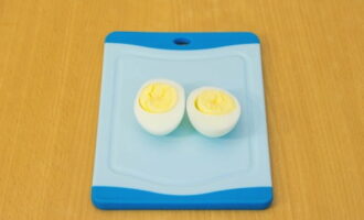 Koel gekookte eieren, pel ze en snijd ze doormidden.