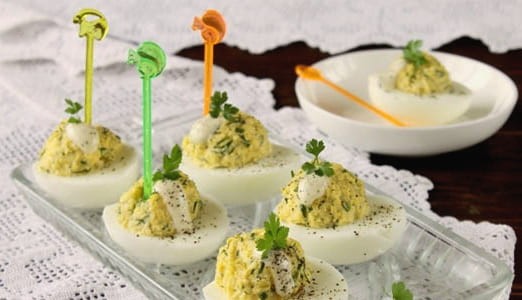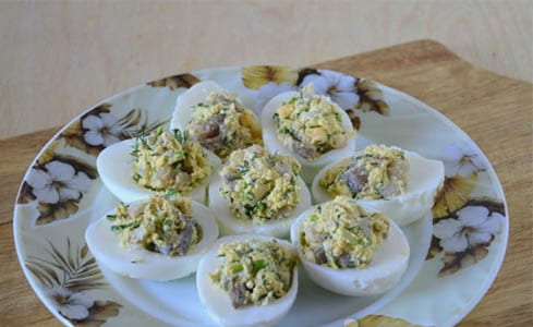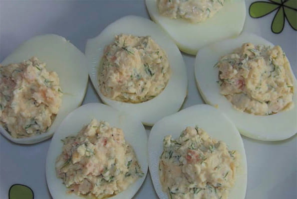 Kippeneieren passen goed bij vis en daarom worden deze ingrediënten vaak gebruikt als basis voor diverse hapjes. Voor bijvoorbeeld gevulde eieren is het kookproces heel eenvoudig: de helften van de eieren worden gevuld met visvulling.
