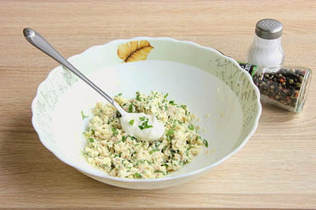 - Doe kruiden en mayonaise in een kom, roer. Kruid de vulling met zout en breng op smaak.
