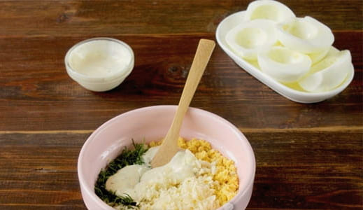 - Prak de dooiers met een vork, voeg gehakte kruiden, geraspte kaas en gehakte garnalen toe. Voeg eventueel een geperst teentje knoflook toe. Roer alle ingrediënten door elkaar, breng op smaak met zout en breng op smaak, breng op smaak met mayonaise.
