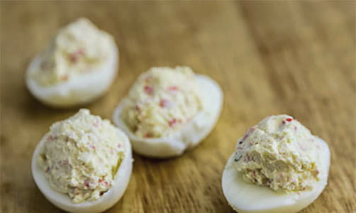 Een helder en mals voorgerecht dat in een mum van tijd klaar is. Deze versie van gevulde eieren is perfect voor een snelle hap, je hebt een paar kippeneieren, krabsticks, kaas en wat mayonaise nodig.