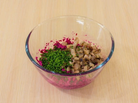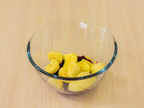- Meng de bieten, mayonaise en dooiers in een kom, prak de dooiers goed met een vork.