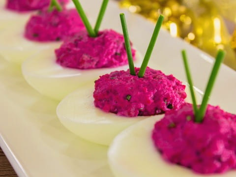 Dit voorgerecht van rode biet en haringeitjes smaakt naar de beroemde haringsalade onder een bontjas. De eieren zijn gevuld met gekookte bieten- en haringvulling; bovendien zullen de gasten de zeer handige portiegrootte waarderen.