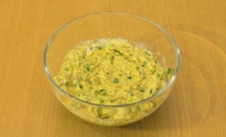 Koel het frituren en maal het in een blender. Meng de resulterende massa met dooiers en kruiden, voeg een beetje mayonaise toe en meng.