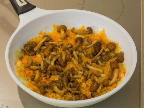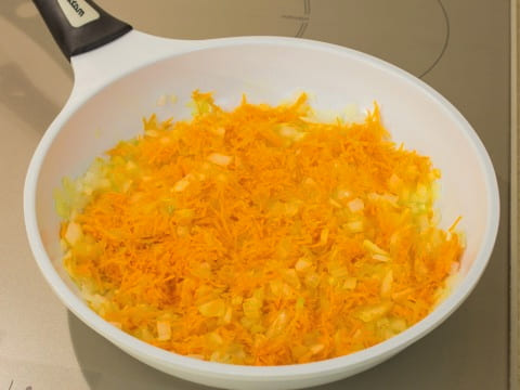Bak de uien in plantaardige olie tot ze glazig zijn en voeg dan de wortelen toe.