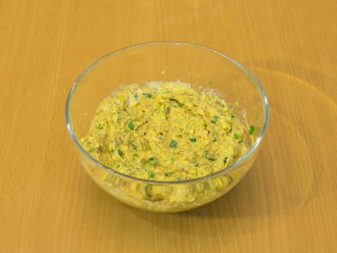 - Hak de ui en kruiden fijn. Doe de dooiers, ingeblikte vis, uien en kruiden in een kom, meng.