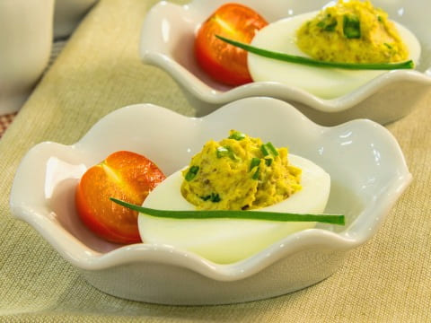 - Vul de eihelften met de vulling, garneer met kruiden en serveer het voorgerecht.