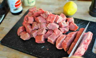 Snijd het vlees in porties - in kleine stukjes - en bereid de bouillon, giet er water bij. Laat ongeveer 2 uur sudderen op laag vuur, regelmatig afromen.