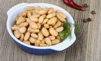 Kook de voorgeweekte bonen apart gedurende een half uur zonder zout toe te voegen. Als je bonen uit blik gebruikt voor het gerecht, open dan de pot.