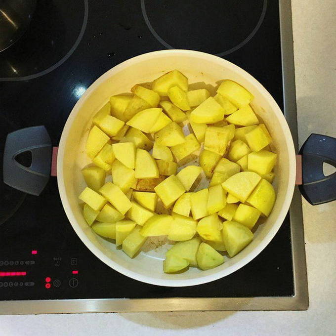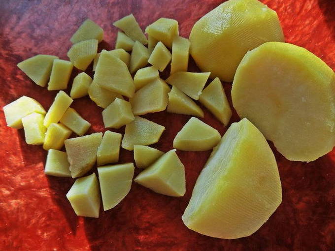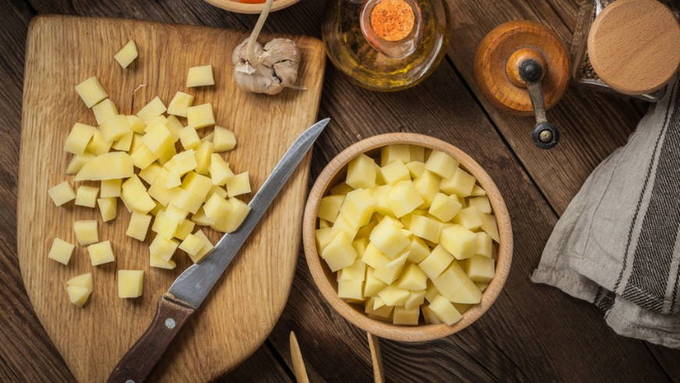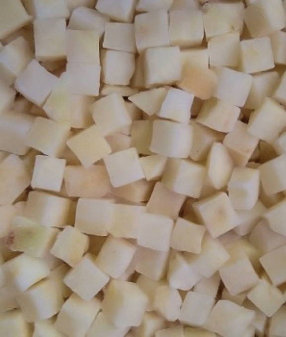 - De aardappelen worden in grote, gelijkmatige blokjes gesneden.
