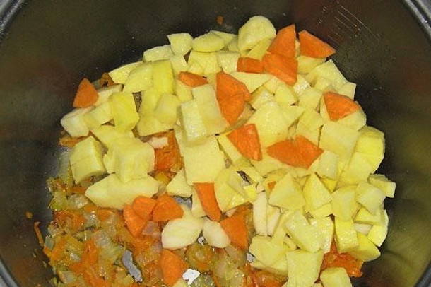 - Doe uien, wortelen en aardappelen in een multikoker-container en kook enkele minuten in de "Bakken" -modus.