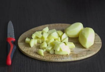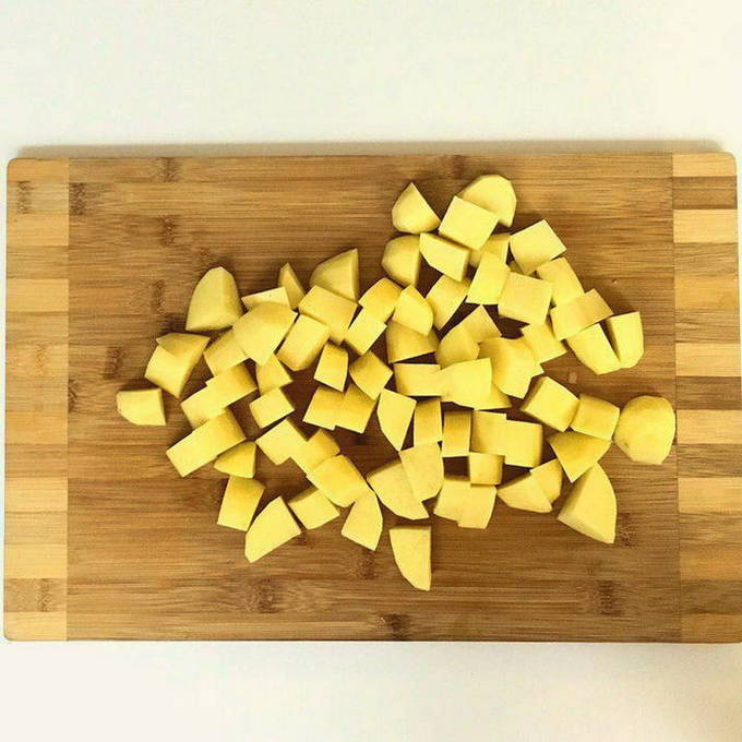 - Snijd de geschilde en gewassen aardappelen in kleine blokjes, hak de ui fijn.