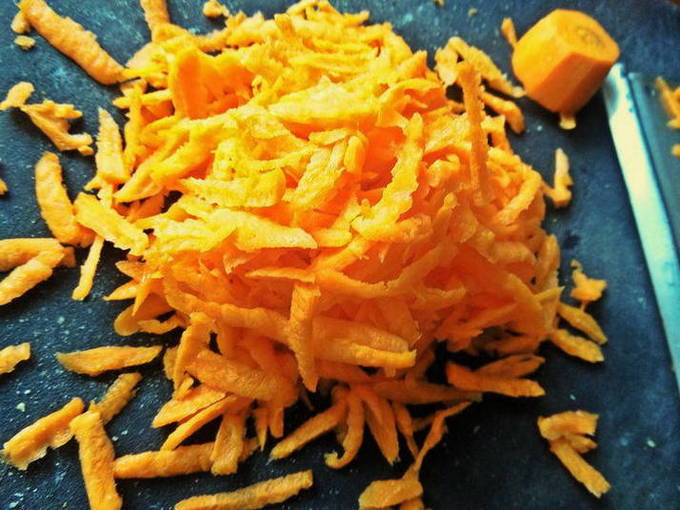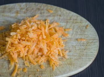 - Rasp de geschilde en gewassen wortelen grof en snijd de courgette in blokjes. Groenten bakken met olie.