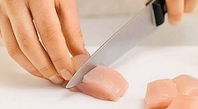 - Snijd de kipfilet in porties - in kleine blokjes of dunne plakjes, voeg water toe en kook ongeveer 15 minuten, af en toe roerend, denk er ook aan het schuim te verwijderen.