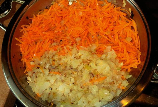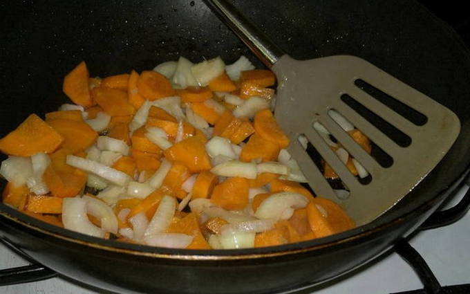 Bereid frituren voor van uien en wortels: hak of rasp groenten en bak ze met een beetje olie zodat ze een gouden tint krijgen.