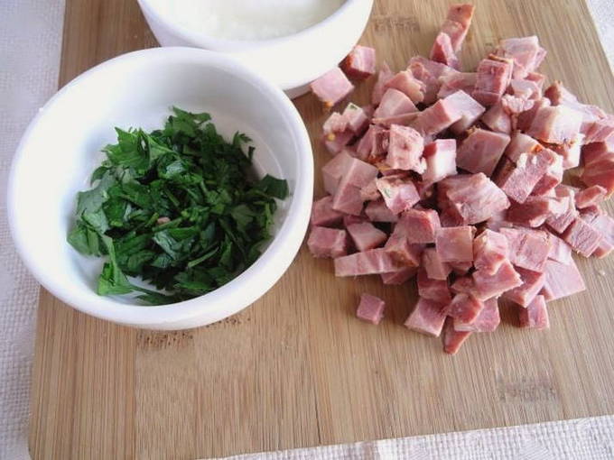 - Verwarm het water in een pan, snijd het gerookte vlees in geportioneerde stukken en leg ze voorzichtig in kokend water, kook een paar minuten.