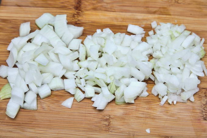 - Zaden worden uit de peper verwijderd, de groente wordt in reepjes gesneden, ui en knoflook - zo klein mogelijk.