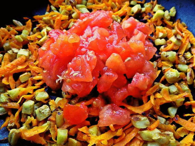 - Voeg een fijngesneden tomaat toe aan de braadpan, waarvan je eerst de schil moet verwijderen.