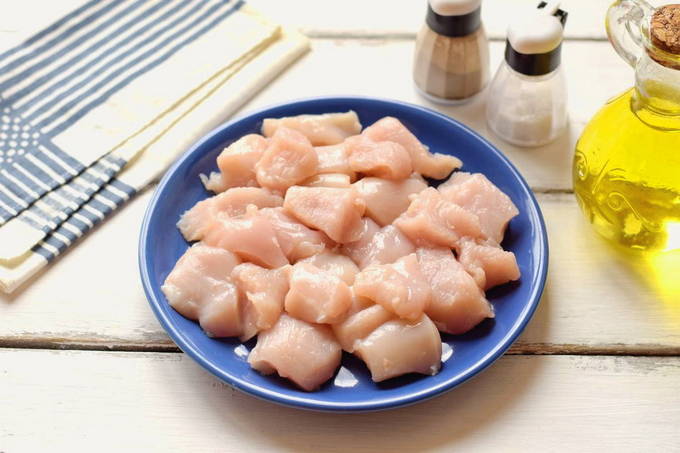 - Spoel de filet, dep met keukenpapier en snijd in kleine blokjes.