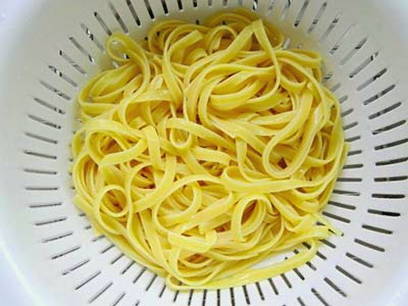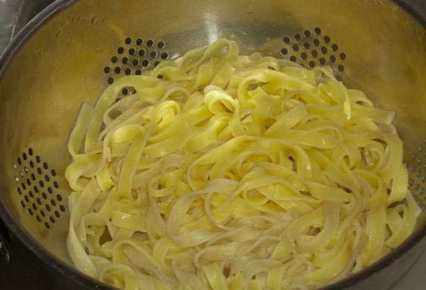 - Kook de fettuccine in gezouten water, laat uitlekken in een vergiet en laat uitlekken.