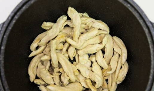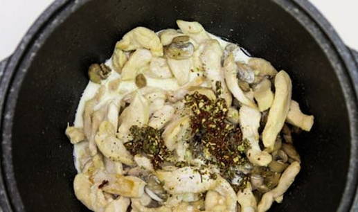 - Snijd de champignons in plakjes, voeg ze toe aan de kip en bak tot het vocht is verdampt.