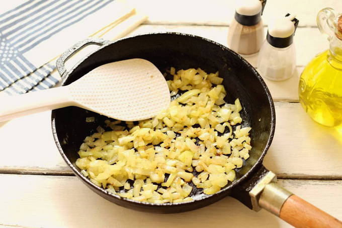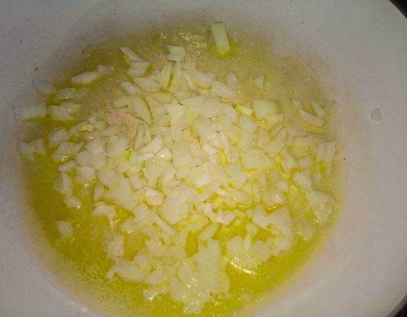 - Giet plantaardige olie in een voorverwarmde pan en voeg er een stuk boter aan toe. Voeg vervolgens gesnipperde ui en knoflook toe, bak 3-4 minuten.