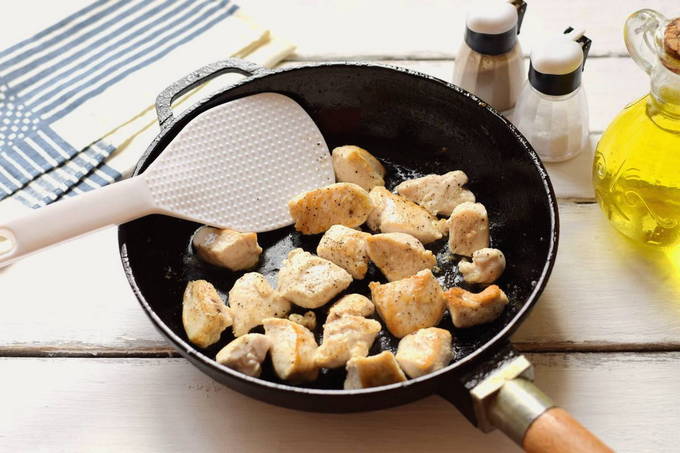 - Was de kipfilet, dep met keukenpapier, snijd in reepjes en bak in olijfolie gaar.