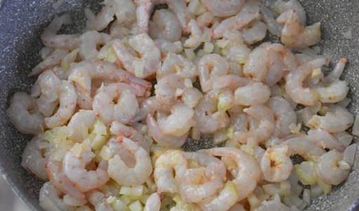 - Voeg vervolgens de gepelde garnalen toe aan de pan, zout en breng op smaak.