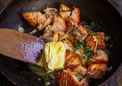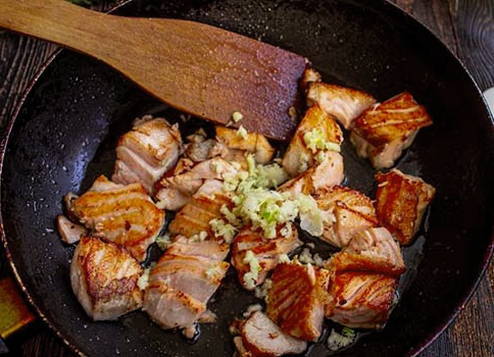- Giet olijfolie in een voorverwarmde pan, leg de stukjes zalm en bak 5-6 minuten, zachtjes roerend met een spatel. Voeg vervolgens de gehakte knoflook toe en roer.