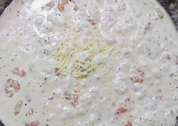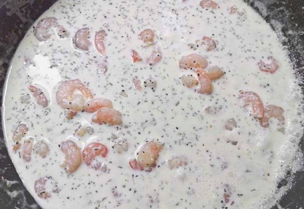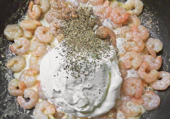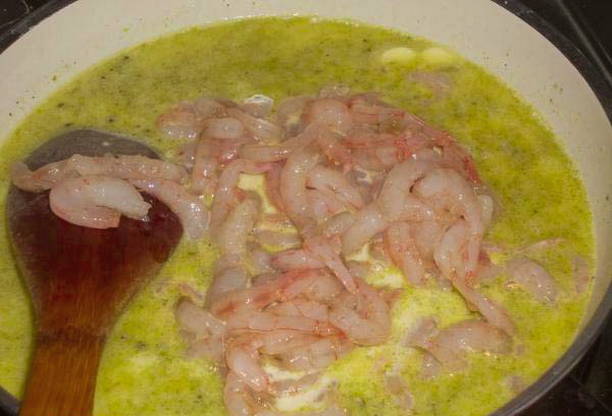 - Voeg vervolgens de garnalen en room toe aan de pan, zout en breng de ingrediënten op smaak.