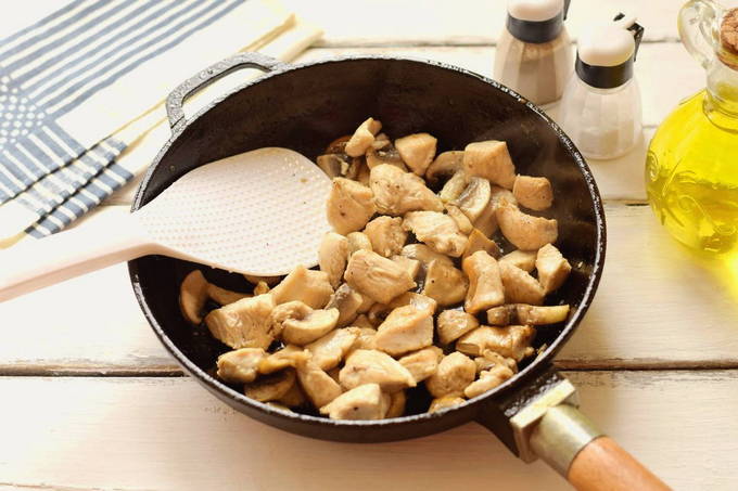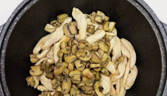- Snijd de champignons in plakjes en voeg toe aan de kip, bak 4-5 minuten.