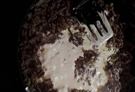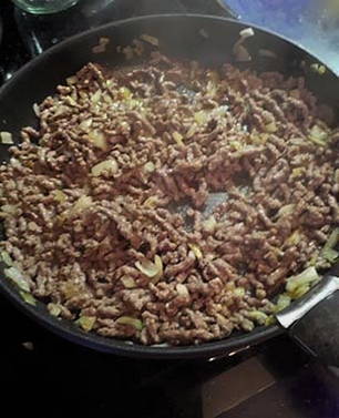 - Fruit de ui in olijfolie tot ze zacht is, voeg dan het gehakt toe, roer het met een spatel zodat er geen grote klontjes zijn en zout naar smaak. Bak het gehakt gaar.