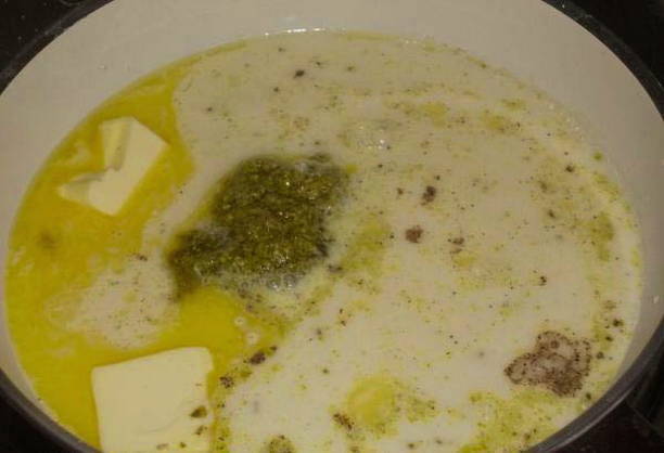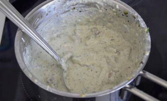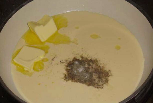 - Smelt de boter in een koekenpan, voeg room, bloem, zout, zwarte peper en gedroogde knoflook naar smaak toe, roer. Voeg vervolgens de geraspte kaas toe en verwarm de saus tot de kaas is gesmolten.