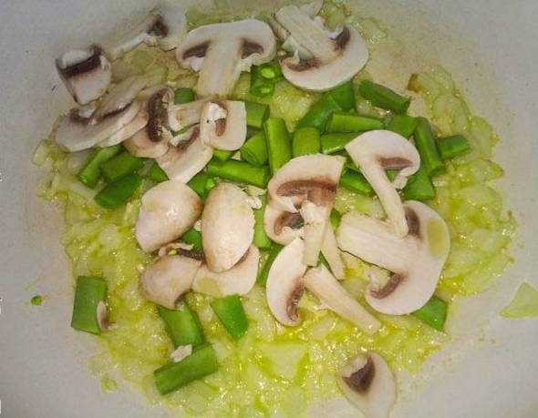 - Leg vervolgens de aspergebonen en champignons neer.