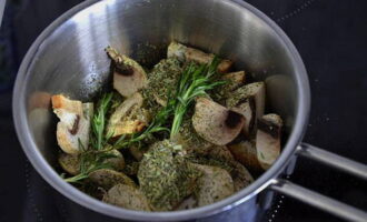 Doe de champignons in een pan, voeg een takje rozemarijn toe en kook 5 minuten op middelhoog vuur.